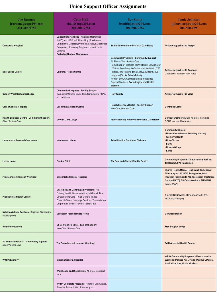 CUPE Local 204‘s Union Support Officers represents the interests of Local 204 members by providing a wide range of labour relations services and by promoting and implementing all policies of Local 204 and the Canadian Union of Public Employees. The latest USO assignments are listed below.